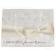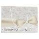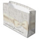 Große elegante Hochzeitsgeschenktasche getan in einem antiken Elfenbein auf Elfenbeindamast-Rosenmuster und in einem Elfenbein mit weißem Blumenmuster, auf dem unteren Teil der Tasche. Grafiken eines großen Bandes des Elfenbeins und der Bogenläufe über der Tasche, zwischen den zwei Mustern. Personifizieren Sie den schwarzen Text, auf dem unteren Teil der Tasche, zum Anzug Ihr Bedarf. Zusammenpassendes Seidenpapier verfügbar. Reizend für Brautpartys oder Hochzeitsgeschenke.
