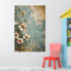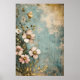 Dieses Bild zeigt eine vintage-florale Tapete mit einem Muster aus rosa und weißen Blumen auf einem texturierten blauen und goldenen Hintergrund.