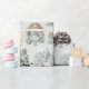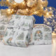 Dieses Weihnachtsgeschenkpapier zeichnet sich durch ein zartes, nahtloses Muster aus staubigen Moosgrün, Elfenbein, Sahne, Gold, Silberzinnern und Viktorianischen, weißen, fickigen antiken Weihnachtsbildern aus vergangener Zeit aus, auf einem abgedämpften, blassgrünen Hintergrund. Zu den grafischen Darstellungen zählen der Weihnachtsmann, Winterschnee, ein Zug, eine Kirche, Weihnachtsgeschenke, ein verzierter Weihnachtsbaum, ein Kind, ein Vogel, saisonales Laub, festliche Garland, aufwändige Rahmen und vieles mehr.