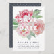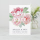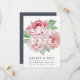 Elegant speichern Sie die Dattelkarten mit einem Spray aus rosafarbenen Blume und grünen Blätter mit "rett our date", überlagert in einer schicken Mischung aus modernen Blockschriften und traditionellen Schriftzeichen. Fügen Sie Ihre Hochzeitsdetails unten in reichen Mitternachtsblau hinzu. Karten kehren zu einem subtilen gepunkteten Diamantenmuster in Weiß auf einem staubblauen grauen Hintergrund um.