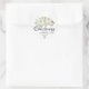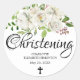 Weiße Aquarellfarben-Rose in schlängelgrünen Blätter schaffen ein wunderschönes Blumenmuster. Ein kleines schwarzes Kreuz wird am Ende des Taufstickers platziert. Das Wort "Christening" ist in einem großen, fließenden Drehbuch geschrieben. Der Name ist in einem einfachen Schriftart geschrieben. Der Vorname ist oben und der mittlere und Familienname der zweite. Das Datum folgt.