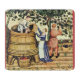 Alte mittelalterliche italienische Miniatur der Weinlese .Klassische Landschaft.Schöne hängende rote Trauben,Weinberge,grüne Herbstlaube.Teil für " Früchte der Saison ".Dieses elegante Design mit alten braunen Pergament-Effekten ist perfekt für Ernährungswissenschaftler,Dietiker,Gastronomen, Gastronomie,Zubereitung oder Restaurant ,Catering ,Weinindustrie.