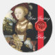 Wunderschönes blondes Mädchen mit prächtigem Kleid und Goldschmuck mit rotem Hut und weißen Federn mit einem Teller voller roter gelber Trauben, Weinreben, roter grüner Herbstlaube mit Seenlandschaft im Hintergrund von der deutschen Malerin Lucas Cranach the Elder 1530 .Klassische, elegante Vintage Kollektion mit flämischen und deutschen Gemälden.Dieses elegante Renaissance-Design mit einem Siegel mit rotem Wachs und Streifen ist ideal für Herbsthochzeiten, Jubiläumsfeiern, Sweet 16 Geburtstage,Save the Date,Dankeschön-Karten, Babyduschen, Feierlichkeiten, Familienfeiern. Es kann auch als geschäftliche Einladung für Ernährungsleute, Diäten, Gastronomen, Gastronomie, Zubereitung oder Restaurant,Catering,Weinindustrie.