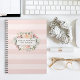 Behalt deine Termine, Kundendaten und mehr mit unserem schicken Blumenheft. Das Design zeichnet sich durch einen Ton auf dem farbenfrohen, rosa gestreiften Hintergrund aus, mit Ihrem Namen und/oder Firmennamen auf einem floralen Abzeichen in Aquarelltönen, das mit Haufen von Rosa, Pfirsich und Creme-Rose und Peony-Blume ausgestattet ist. Ideal für Salons, Stylisten, Make-up-Künstler oder Geschäfte.