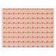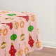 Tablecloth in einem Muster verschiedener antiker Weihnachtsbaumschmuck, in tiefrot, dunkelgrün, weichem Gold und Rosa, mit einem weichen pfirsichfarbenen Hintergrund
