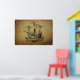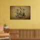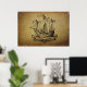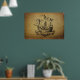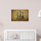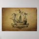 Antiquitätenschiff Illustration einer Galerie auf hoher See mit der Aufschrift "Fluctuat Nec Mergitur", die als "Es wird von den Wellen geschlagen, aber nicht gesunken" übersetzt. Die Segel des Schiffes sind voll von Wind und seine Flaggen fliegen stolz. Die Schiffsillustrierung hat einen goldbraunen Hintergrund, der wie altes Papier aussieht.