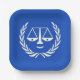 Abschluss der Juristenschule, Jurist-Geburtstag oder Anwaltskanzlei Party-Teller mit lustigen, auf blauem Hintergrund personifizierten Justizmaßstäben.