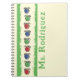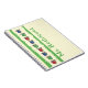 Eine Reihe Äpfel in Primärfarben auf einem gelben Notizbuch mit grünen Streifen und Platz für den Namen. Holz gezeichnet und gefärbt von Indie Artist WindyDesign.