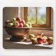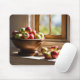 Reife Äpfel in einer Holzschüssel durch ein sonniges Bauernhaus Fenster