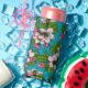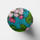 Handgezeichnete Apfelblüten und Bienen auf türkisfarbenem Hintergrund