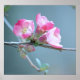 Ein Foto eines Apfelzweiges mit rosa Apfelblüten auf blauem/grauem Hintergrund.