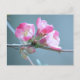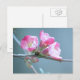Ein Foto eines Apfelzweiges mit rosa Apfelblüten auf blauem/grauem Hintergrund.
