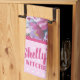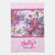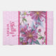 These beautiful kitchen towels have a pattern of apple blossoms in the center and pink with white polka dots on the top and bottom. A dark pink fuschia faux ribbon separates the sections. The ties are also dark pink to match. At the bottom you personalize it with the person's name. There are also pot holders and oven mitts and aprons to match, as well as other items.