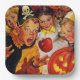 Ein Retro-Halloween-Aufkleber, der ein lustiges Bild zeigt, das Kinder Mitte des Jahrhunderts in einem Halloween-Party für Äpfel bohren. Ein Junge beobachtet, wie sein Zahn im Apfel abfliegt. "lass dir deinen süßen Zahn nicht ab!"