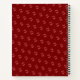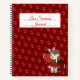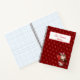 The spiral notebook design has the "Juicy Apple" diagonal pattern on a deep red background on both the front and back. The artist's apple chibi character is located at the bottom right of the front cover, which also features a white box with red borders with the owner's name and journal writing inside. The dashes give the box a notebook appearance.