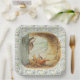 Darling Bunny Rabbit mit farbenprächtigem Holzland Blumenhintergrund. Der Hase sieht Karotten hinter einer rustikalen Gartentür. Public Domain Beatrix Potter Illustration. Ich habe es etwas für den Druck verbessert.