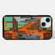 Ein rustikales, rauh aussehendes Design in Schattierungen von Orange, Türkis, Braun und Grau überzieht diese Apple iPhone 15 Hülle (Case Mate).