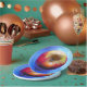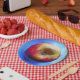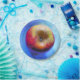 Ein Kunstdesign eines Apfels vor blauem Hintergrund.