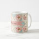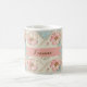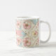 Ein Blumen-Applikations-Patchwork-Muster mit rosa und elfenbeinfarbenen Blumen, grob auf blauem und elfenbeinfarbenem Stoff aufgenäht, mit abgenutzter, écru-farbener Spitze gibt diesem Becher ein shabby-chic-Look, den Sie lieben werden. Erinnert an eine alte Decke, die in einem Dachboden vergessen wurde. Sehr feminin, perfekt für jeden, der Nähen liebt.