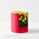 Dieses ist eine schöne Tasse mit einem inneren Gelb und Rot auf der Außenseite mit einem erneuernbild der Frühlingstulpen und des berühmten Sprichworts "April-Duschen holen Mai-Blumen"