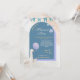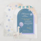Featuring a peaceful color palette, arch frame, cute stork illustration, and customizable event details, this card brings a warm and loving touch to your celebration.