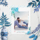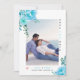 Aqua blühende Blumen, grüne Blätter und Foto Save the Date Foto Ankündigung. Ein hübsches Design, das ein Foto, Aquablau-Blumen in den oberen links und unteren rechten Ecken zeigt, den Text "Save the Date" in schwarz und blau und ein rot rosa Herz. Auf der Rückseite befindet sich ein Polka Punktmuster in Blau und Weiß.