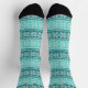 Diese hübschen Socken eignen sich perfekt für die Feiertagssaison, können aber auch den ganzen Winter hindurch gut laufen. Sie zeigen ein sich wiederholendes Muster von Imitaten Strick poinsettia Blume Bilder. Die Bilder wechseln sich in blassblauem Aquablau und aquamarinem Hintergrund ab, dazwischen sind Streifen zu sehen.