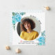 Aqua Blue Blumen Klasse der 2025 Abschluss Foto Ankündigung. Ein hübsches Design, das ein Foto, aqua-blaue Aquarellfarben-Blume in den oberen links und unteren rechten Ecken zeigt, den Text "Class of 2025" und ein rosa Graduierungshülse. Auf der Rückseite befindet sich ein Polka Punktmuster in Blau und Weiß.
