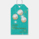 Imitate Gold-Glitzer und silberweiße Bäume Glühbirnen sind das Feature auf der Vorderseite dieser eleganten Holiday Geschenktipps. Die glitzernden Bilder werden auf einem aqua blauen Hintergrund mit Bits von Silber und Gold Stern Konfetti platziert. Der untere Teil enthält einen benutzerdefinierten dunklen Goldtext, der derzeit "MERRY CHRISTMAS HAPPY NEW YEAR" lautet. Die Rückseite des Tags hat das gleiche Bild mit einem zusätzlichen Textfeld.