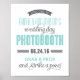Der Poster-Druck von 8 x 10" Foto kann mit Braut- und Bräutigamen und Hochzeitsterminstext personalisiert werden. Das Unterschreiben lautet: "Herzlich willkommen zum Hochzeitstag-Fotostand von Braut und Groom, Hochzeitstag (xx.xx.xx), schnappen Sie sich einen Requisiten und schlagen Sie eine Pose!". Aqua / Türkisblau, Holzkohle grau und weiß.