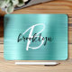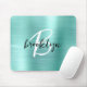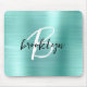 This elegant personalized mouse pad features a monogram and first name in modern black and white script on an aqua brushed metal background.