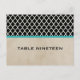 Elegante und moderne Chic Quatrefoil Wedding Tischnummer Postcard mit einem trendigen marokkanischen Muster Hintergrund, einem Vintagen Papierhintergrund und einem Paar dünne türkisfarbene Streifen. Diese stilvolle Tischkarte ist einfach zu anpassen, fügen Sie einfach die passende Tischnummer(en) hinzu. Klicken Sie auf "Anpassen", um weitere Personalisierungsoptionen zu erhalten.