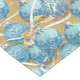 Exquisit illustriertes Weihnachtskugelmuster mit weißen Bändern, die durch Konfetti fließen, mit goldenen Bändern und goldfarbenem Hintergrund verziert. Von Surface Muster Designer L Diane Johnson.
