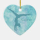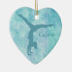 Eine Silhouette Aqua Girl Gymnast macht einen Handstand auf einer Seite dieses hübschen Ornaments. Ihr Name ist rechts von der Gymnastikfigur. Alles wird auf einem leichteren, aquamarinen, wirbelnden abstrakten Hintergrund mit Touchs von blassem Lavendel platziert. Die Rückseite des Ornaments hat ein weißes, herzförmiges Feld mit mehr Textfeldern, die Sie anpassen können. Das Textfeld ist mit einem Imitat Diamant-Herzrahmen gerahmt, der dann auf dem gleichen aqua-wirbelnden Hintergrund wie die Vorderseite des Ornaments platziert wird. Schön und personalisiert für alle Girl-Gymnastiker!