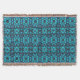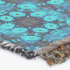 Ein symmetrisches, kaleidoskopisches Muster weist dynamische Blautöne mit Akzenten von roten und dunklen Konturen auf. Das komplexe Design bildet ein sich wiederholendes Motiv und erzeugt einen faszinierenden visuellen Effekt.