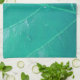 Das abstrakte Kunstwerk auf diesem Küchentuch ist ein Originalfoto von ZoeSPEAK eines Meerestraubenblattes nach einer leichten Dusche. Ein paar Regentropfen sind im Foto zu sehen, das die Adern des Blattes zeigt, die quer durch das getönte Aqua-Design parallele lineare Muster bilden.
