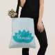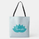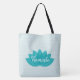 Stilvoll überall bedruckt Yoga Tote-Tasche, die in einem Rotkehlchen in der Farbe Eiblau und Weiß des Polka-Dots-Musters gemacht wurde, mit der Grafik einer Aqua-Lotus-Silhouette in der Mitte. Der weiße Skripttext liest Namaste und kann personalisiert sein, zu lesen, was Sie gewollt haben.