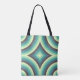 Dieses Bild weist ein auffallendes geometrisches Muster auf, das aus konzentrischen Kreisen besteht, die sich in der Mitte zusammenreihen, um ein Diamantenmotiv zu erzeugen. Die Farben wechseln harmonisch vom Aquablau zum Minzgrün, umgeben von dunkelgrauen Linien, und erzeugen ein lebendiges Gefühl von Bewegung und Tiefe. Der Gesamteffekt fühlt sich sowohl zurückhaltend als auch modern an und erinnert an psychedelische Kunst und Textilmuster der Mitte des Jahrhunderts