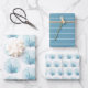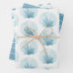Diese wunderschönen Geschenkfolien verfügen über Aqua-Muscheln in Aqua-Aqua-Aqua-Muscheln auf einem soliden, weißen Hintergrund auf zwei Bogen mit einem soliden, aqua-blauen und weißen dünnen Streifen auf der dritten.