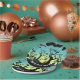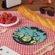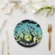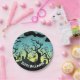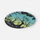 Aqua und gelb Spuk Friedhof Halloween Papierteller. Ein Spuk Friedhof in Aqua-Blau und Gelb mit Grabsteinen, spukigen Bäumen, Schädeln, Hexe, Eule, Fledermäuse und Ihr Text "Happy Halloween" sind die Elemente dieser Papiertafel.