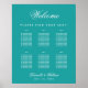 Eine einfache Sitzkarte mit 6 Tischen, für eine Hochzeit mit aquamariner Hochzeitsfarbe. Der Hintergrund ist aquamarin, der Text weiß. Das Wort Willkommen im oberen Teil und die Namen sind in einem eleganten kalligrafischen Skript geschrieben, die Erholung in Kappen.