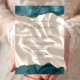 Die Ober- und Unterkante dieser eleganten, modernen Hochzeitseinladung zeichnet sich durch eine aquamarine blaue Aquarellgrenze aus, die mit Imitaten mit goldenem Glitzer bestickt ist. Der anpassbare Text kombiniert Handschrift, Serif und kursiv Schriftart in Holzkohle grau auf einem Hintergrund-Bild von Elfenbeinseide. Auf der Rückseite ist ein aquamarines Age- und Elfenbeinseidendesign zu sehen.