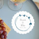 Set von 6 runden, absorbierenden Pulp-Board-Getränkekittern für Polterabende, Hochzeitsfeiern und sogar Proben-Dinners, die eine trendige, aquamarine blaue Farbe, schlichtes Herzkrautdesign, Braut- und Bräutigamen und das Hochzeitstermin in dunkelgrauer, stilisierter Schrift aufweisen. Bearbeiten und ersetzen Sie Namen und Datum mit Ihrem eigenen.