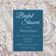 Einfache Stil, Brautduscheinladung mit einem aquamarinen, blauen Hintergrund, dem Namen und der Veranstaltungszeit der zukünftigen Braut, dem Ort, dem Kontakt usw., in weißer, stilisierter Schrift gedruckt. Personalisieren Sie Ihre Einladung, indem Sie Text durch eigene Brautparty-Informationen ersetzen. Wählen Sie Ihre Einladung Papier Stil und Quantität.