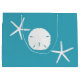 Tropische Weihnachten aquamarin blaues Papier Geschenktasche in großer Größe. Weißer Seestern / Meeressterne und Sand Dollar schmücken beide Seiten. Passen Sie den Gruß an zwei Stellen auf der Vorderseite an. Beispielworte sind "Frohe Weihnachten" und "Glückliches Neues Jahr".
