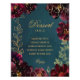 Eine aquamarine Blautöne Hochzeit Desserts Tischliste mit einer Sinfonie von tiefbordeaux-Himbeererponys mit Goldspray und schimmernden goldenen Konturen versammelt sich um einen aquamarinen, blauen Aquarell-WaschHintergrund mit Ihren Namen in goldfarbenen rustikalen Schrift und einem kleinen, nicht-serf-Schriftart in Großbuchstaben, der die Details ankündigt.