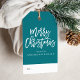 Geben Sie Ihren Urlaubspaketen mit modernen Geschenketiketten einen besonderen Stellenwert. Die individuellen Weihnachtsgeschenke-Tags sind mit "Frohe Weihnachten" in einem trendigen Script-Schriftart, aquamarinem Hintergrund und einem Kiefernmuster auf der Rückseite des Designs ausgestattet.