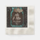 Rustikale aquamarine Hochzeitspapierservietten mit Maurerkirsche und Kaminherzen auf Stallholzhintergrund.