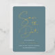 Bitte laden Sie die Gäste ein, ihre Kalender für Ihre Hochzeit mit diesen modernen und minimalen speichern Sie die Terminkarten. Einfache Design-Features "Save the Date" in handgeschriebenen Goldfolien-Skripten auf einem staubigen aquamarinen blauen Hintergrund, mit Ihren Namen, Hochzeitstermin, Standort und Website darunter. Fügen Sie ein beliebtes portrait-orientiertes Verlobung-Foto auf die Rückseite.