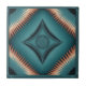 Ein symmetrisches geometrisches Muster in quadratischem Format mit aquamarinem und kupferfarbigem Schema. Das Zentrum verfügt über eine große, rautenförmige Medaille mit aufwändigen Linienarbeiten und einem kreisförmigen Sonnenburstmuster im Inneren. Das Medaillon ist von vier kleineren diamantenförmigen Rahmen mit verzierten Grenzmustern umgeben. Der Hintergrund strahlt einen Sonnenbursteffekt aus, der von der Mitte ausgeht und ein dynamisches Bewegungsgefühl schafft. Der äußere Rand besteht aus zackigen, säzahnähnlichen Spitzen in Kupfertönen vor dem aquamarinen Hintergrund. Das gesamte Design ist durch einen dünnen gepunkteten Linienrand eingeschlossen. Die Farbpalette wechselt von tief aquamarin in der Mitte zu helleren türkisfarbenen Tönen in der Nähe der Kanten, mit Kupferakzenten in den Spitzen und dekorativen Elementen. Das Muster hat mit seinen geometrischen Formen und strahlenden Motiven einen amerikanischen oder südwestlichen Gestaltungseinfluss.